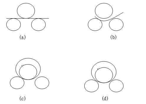 該機結構形式為三輥對稱式。上輥在兩下輥中間對稱位置作垂直升降運動,通過蝸輪、蝸桿而獲得,兩下輥作旋轉運動,通過減速機的輸出齒輪與下輥齒輪嚙合,實現(xiàn)板材的行走。當上輥的下壓力超過材料的屈服限度時,便使所卷制的材料變形,變形過程如下圖: